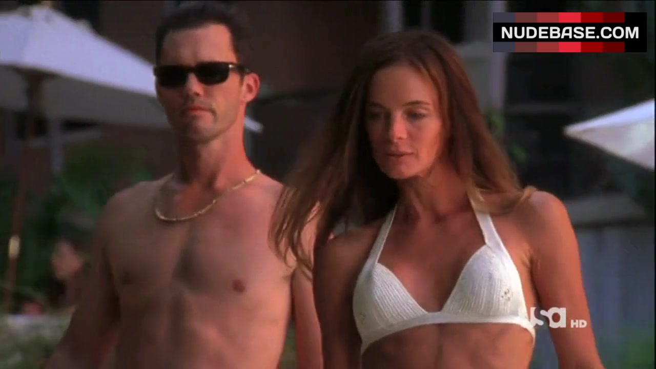 In this scene from the drama "Burn Notice" (2007) Gabrielle Anwar is hot in white bikini.