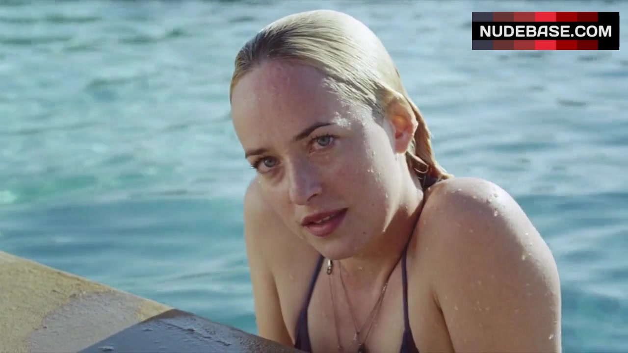 In this scene from the mystery drama "A Bigger Splash" (2015) Dakota Johnson is hot in bikini.