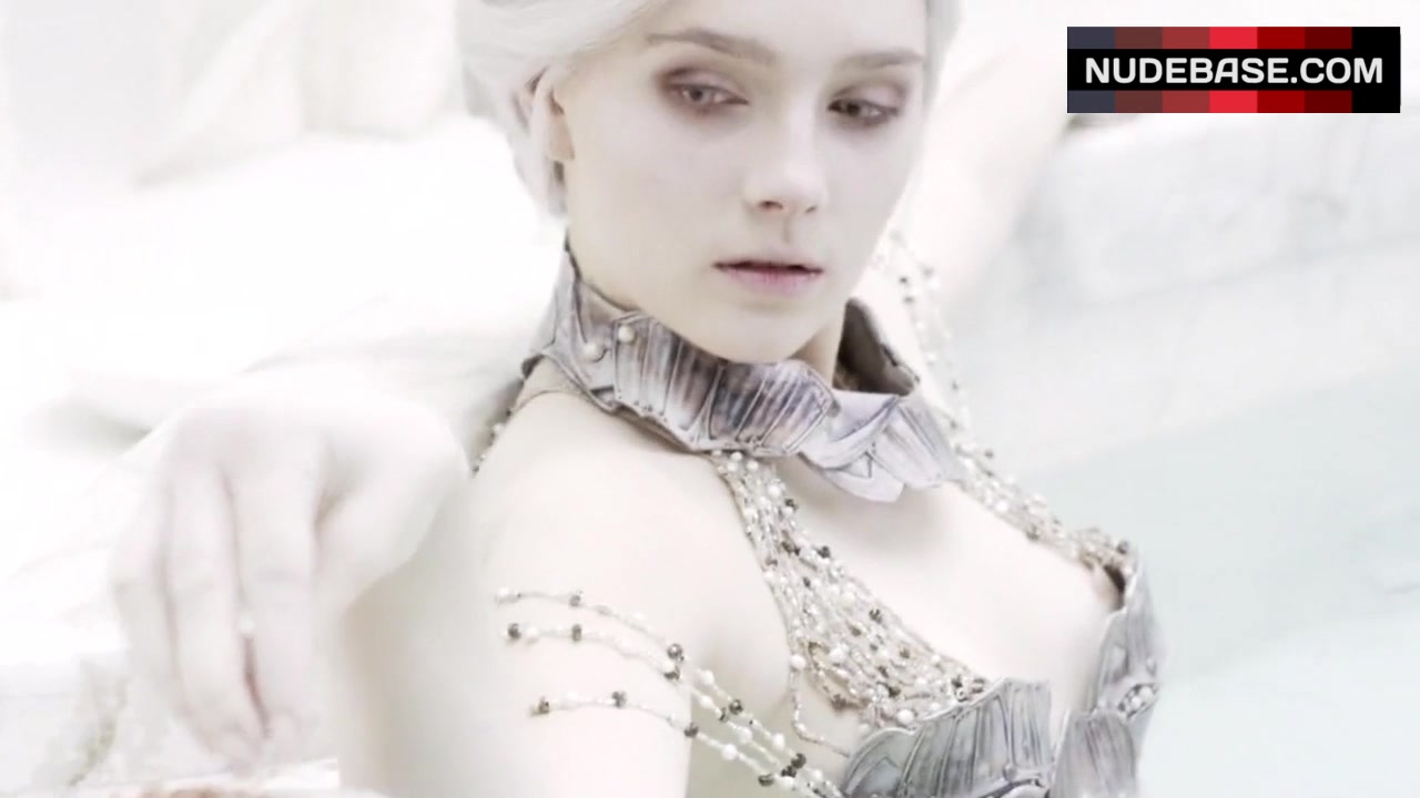 In this scene from the drama "Defiance" (2013) you can see Amy Forsyth in white bikini.
