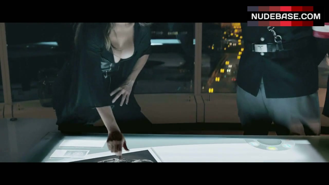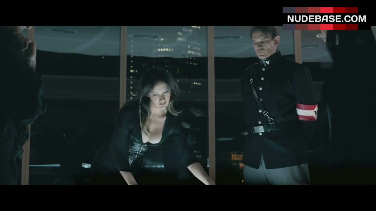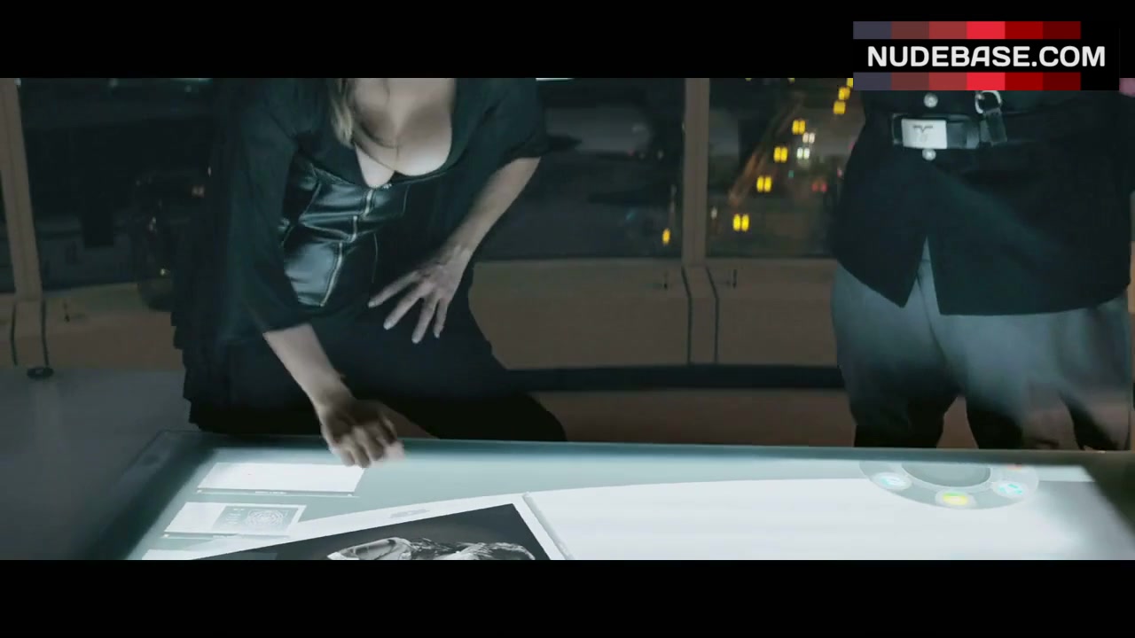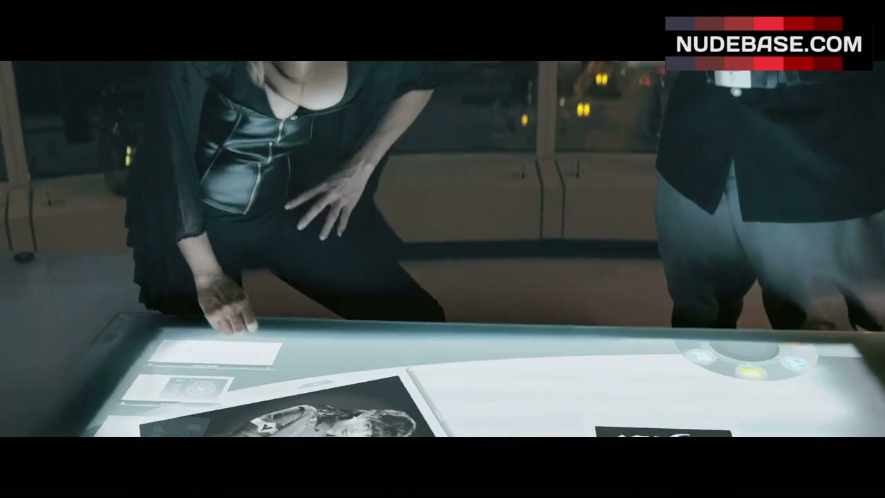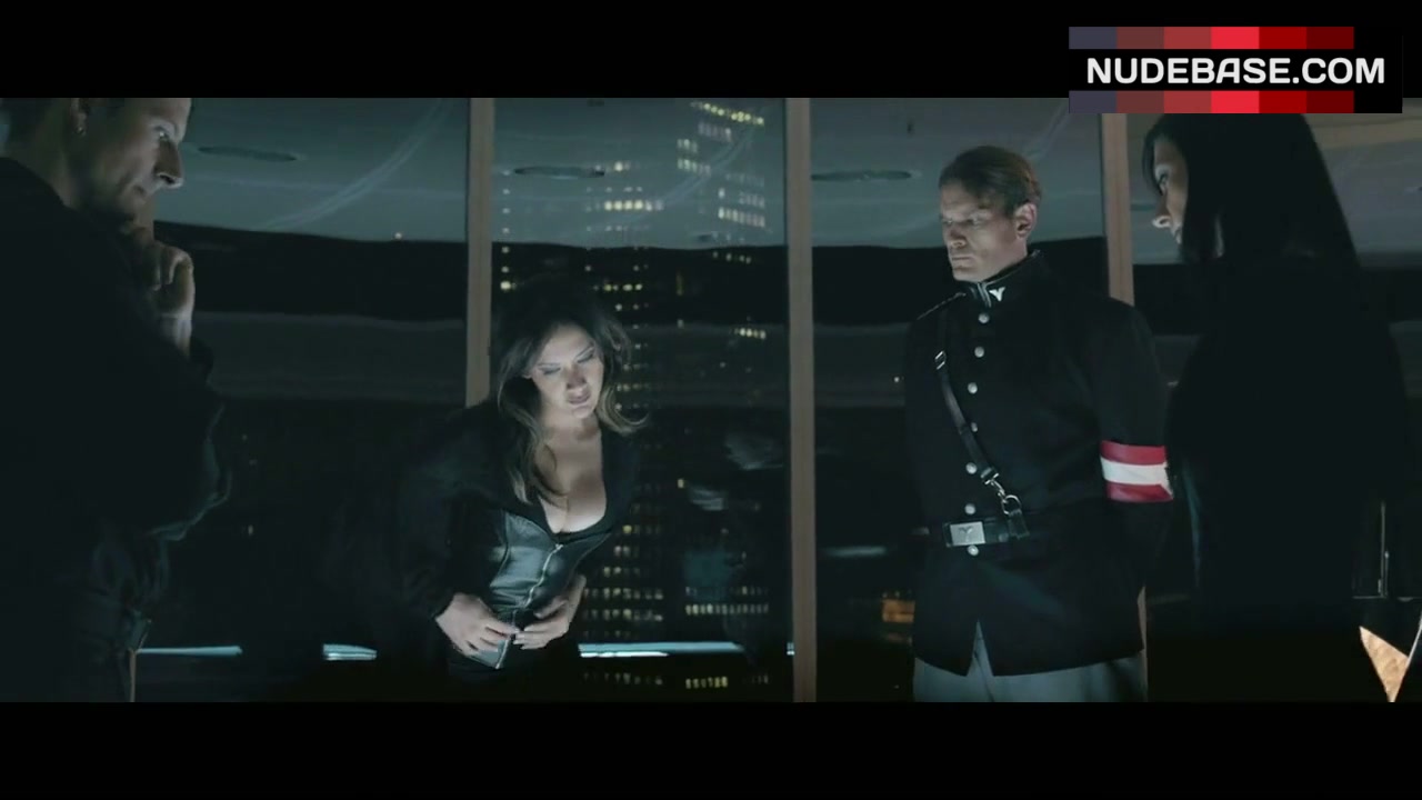 In this scene from the comedy "Iron Sky" (2012) you can see Peta Sergeant showing cleavage.