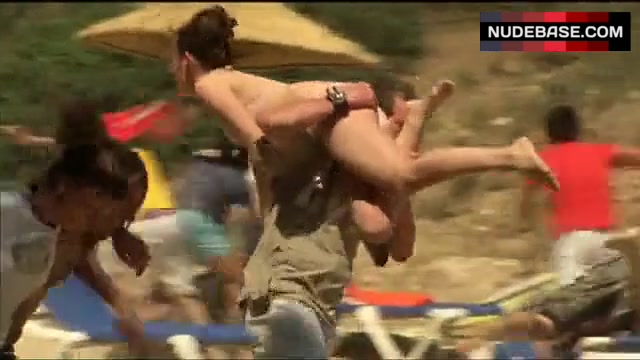In this scene from the movie "Killer Swarm" Paula Schramm is hot in pink bikini.